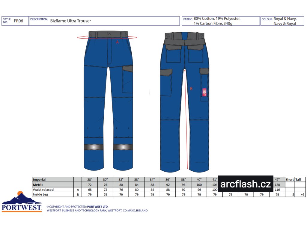 Kalhoty navrženy s použitím vysoce inovativní Bizflame™ Ultra ohnivzdorné tkaniny s přidanými antistatickými vlastnostmi. Trojité prošití, mosazné zipy po celé délce pro extra pevnost a dlouhou životnost. Kalhoty obsahují dvakrát prošité reflexní pruhy s vysokou viditelností na nohavicích.